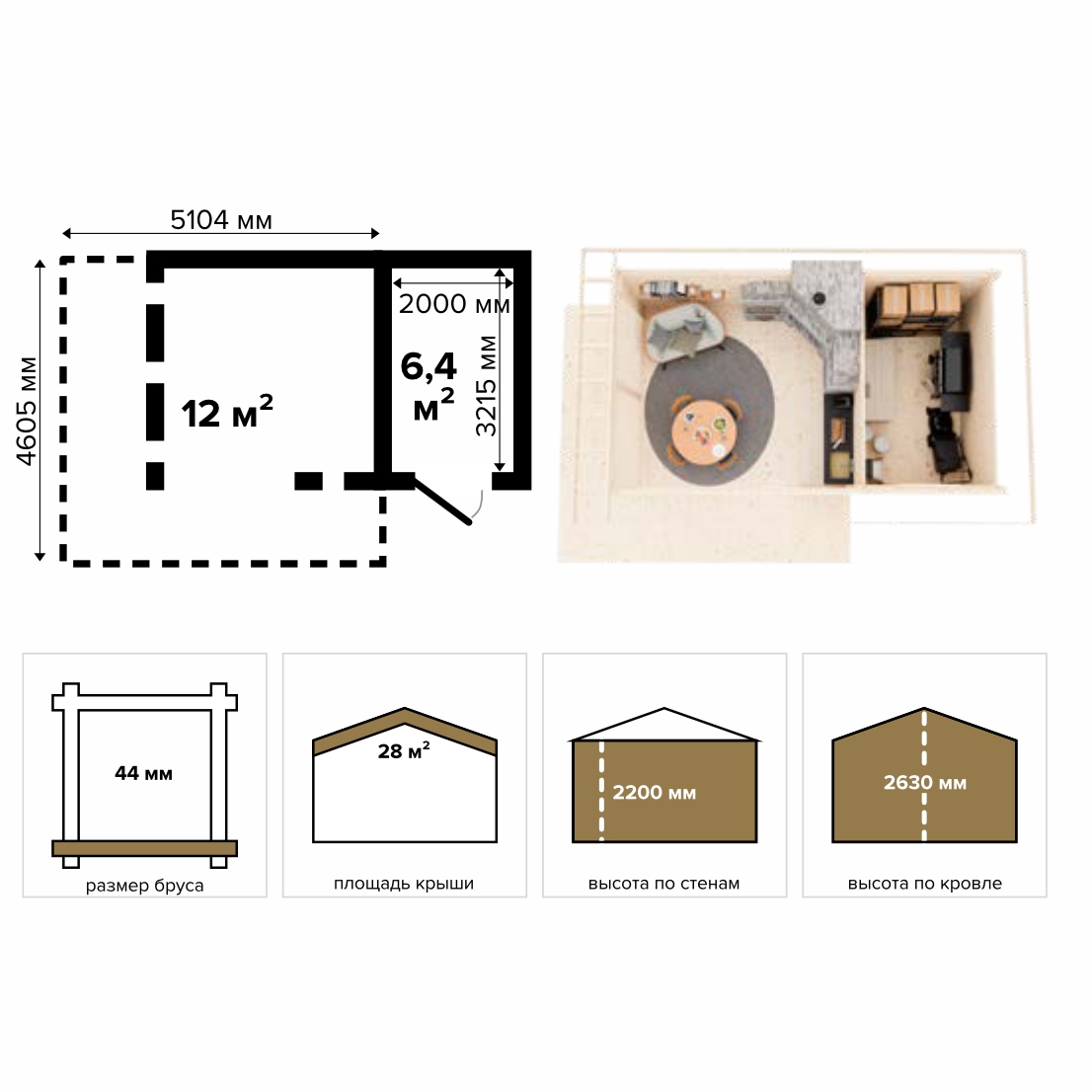 Беседка 18 с хозблоком (Стандарт) - брус 44 мм